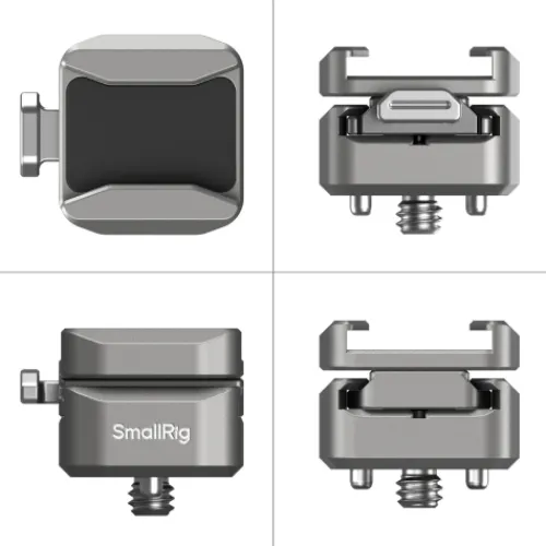 The SmallRig HawkLock H18 Quick Release Support with Cold Shoe 4500 offers a secure quick-release solution for cold shoe accessories like LED lights and microphones. It includes a cold shoe adapter and a baseplate with an anti-detachment column and groove design, which locks accessories in place and holds up to 0.800kg. Silicone pads on the adapter provide stability and prevent scratches. The baseplate’s spring-loaded pins add further security, making it compatible with SmallRig action camera cages with locating holes.