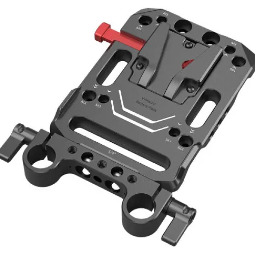 The SmallRig V-Mount Battery Plate with Dual 15mm Rod Clamp 3016 is designed to provide greater battery life for your camera rig, fitting most V-mount batteries with easy access to power ports. The included dual 15mm rod clamp allows for flexible mounting on your 15mm LWS rod system in various configurations. The plate features multiple countersinks and threaded holes, including 1/4″-20″, M3, M4, and an ARRI 3/8″-16 thread hole, enabling attachment of a dual rod clamp, magic arm, or other accessories. Two stoppers prevent the battery from twisting when mounted. The plate is also compatible with the Blackmagic URSA Mini.