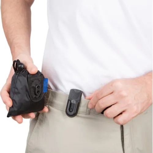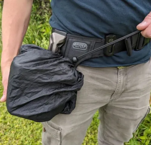 When closed, the rain cover may be worn on your belt with the included Spider Monkey Holster Base. Simply slide the cover onto the base until it snaps into place, and remove it by depressing the release tab on top of the base. The base is compatible with the SpiderPro belt, Black Widow belt, and the Large Lens Pouch. The rain cover is meant to be used while your camera is inside the SpiderPro or Black Widow holster. This feature makes installation and removal fast and easy.
