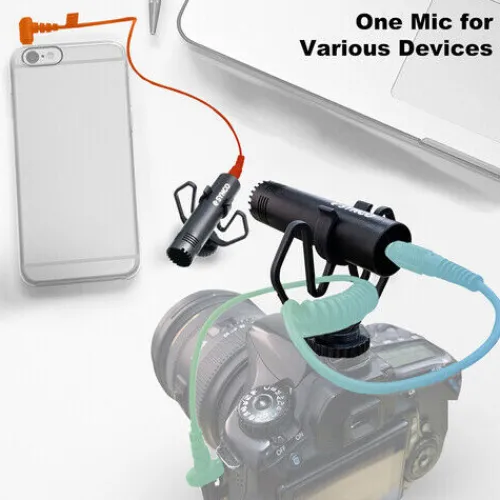 This professional microphone comes with both a standard 3.5mm TRS cable for use with cameras as well as a 3.5mm TRRS cable designed for use with smart devices such as phones. If your smart device has a 3.5mm jack, it will work directly, but if not, you can easily purchase an adapter. Adapters are available for Android and iOS devices.