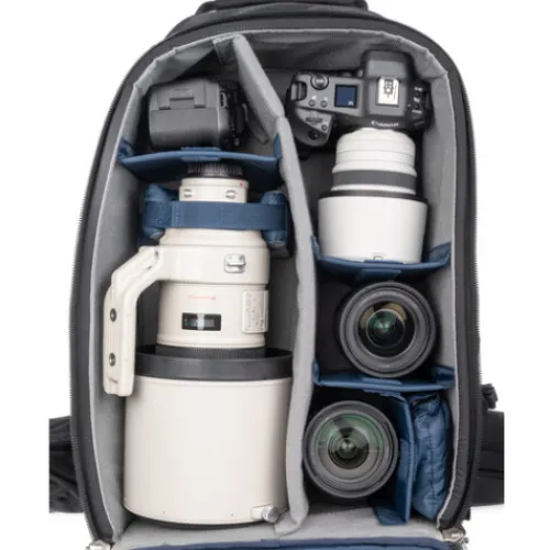 Holds two gripped DSLRs, eight standard zoom lenses, and two flashes. Accommodates detached lenses up to 600mm f/4 lens or an attached lens up to 500mm f/4