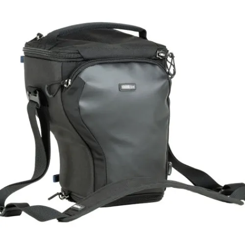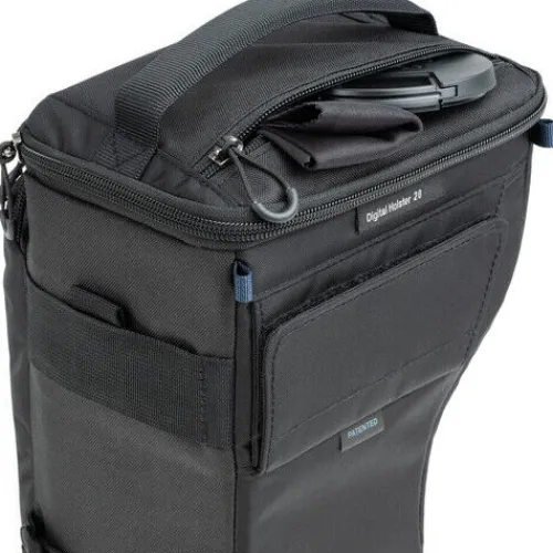Protect and carry your camera with the V3 Digital Holster 20 from Think Tank Photo, designed to fit a standard mirrorless body with a 24-70mm lens attached and the hood reversed. The “pop down” feature allows the holster to expand, accommodating a 70-200mm f/2.8 lens with its hood reversed. A removable soft divider helps protect your camera’s LCD screen from the strap. Carry it using the top handle, wear it over your shoulder with the removable nonslip strap, or attach it to your belt via the rear loop for convenient access.