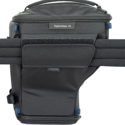 Protect and carry your camera with the V3 Digital Holster 40 from Think Tank Photo, designed to fit a gripped DSLR with a 24-70mm f/2.8 lens and the hood reversed. The “pop down” feature allows the holster to expand, accommodating a 70-200mm f/2.8 lens with its hood reversed. A removable soft divider helps protect your camera’s LCD screen from the strap. Carry it using the top handle, wear it over your shoulder with the removable nonslip strap, or attach it to your belt via the rear loop for convenient access.