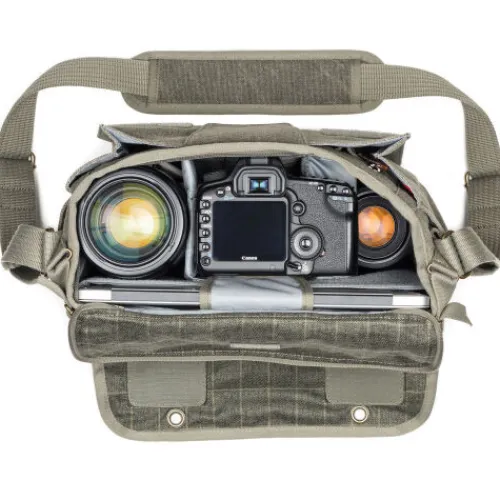A sleek, subtle bag for photographers on the go, the black Retrospective 7 V2.0 Shoulder Bag from Think Tank offers versatile storage for camera bodies, lenses, laptops, tablets, and accessories. It comfortably holds a standard DSLR, two lenses, a flash, and a 10″ tablet or 13″ laptop. The main compartment features a zippered opening that tucks away when not in use, while the hook-and-loop front flap allows for quick access. A luggage handle pass-through flap on the rear adds convenience for travel, and the front compartment with a zippered pocket keeps valuables secure. A seam-sealed rain cover ensures protection in wet conditions.