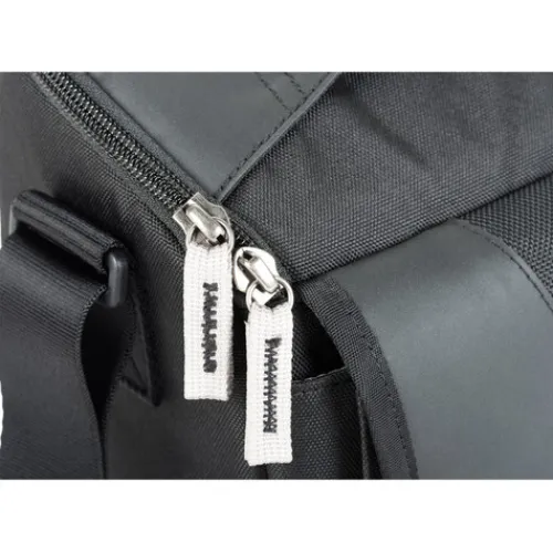 The padded bag has a DWR-coated 600D polyester exterior with a polyurethane coating on the underside for weather protection. The 200D polyester interior and closed-cell foam dividers protect and secure the equipment.