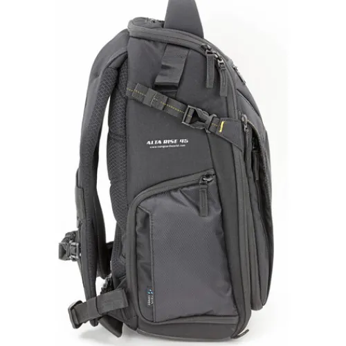 The Black Alta Rise 45 Backpack from Vanguard is designed with a sleek form to follow function. It can hold a Pro DSLR, 4-5 lenses up to 24-70 f/2.8, a flash, related accessories, and a laptop or tablet. The +6 revolution allows users to easily expand or reduce storage size with one zip motion around the Alta Rise 45. It also features a variety of pockets, including a rear concealed pocket for valuables, and a pocket with a compression strap above for attaching a small tripod, accessory, or water bottle.