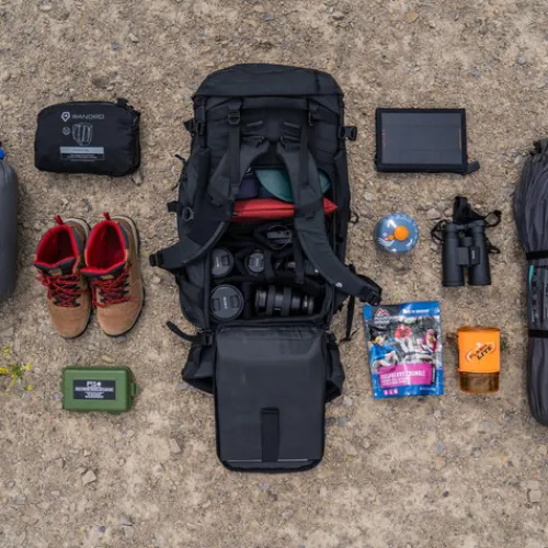 To protect your gear, the shell is made of 420D ROBIC and 630D nylon treated with a waterproof coating. For maximum comfort there are six adjustment points for the backpack harness to ensure maximum comfort for any user. In addition to the shoulder straps, a sternum strap and a waist belt offer improved stability when you’re moving over rough and rocky terrain. Bulky backpacks can be a hassle when moving through airports or transportation hubs, so WANDRD integrated a luggage handle passthrough on the back panel that allows you to put your pack on a rolling case and wheel it at your side.